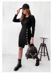 Kadın siyah uzun kollu bisiklet yaka yan yırtmaç düğme detay kısa kaşkorse elbise